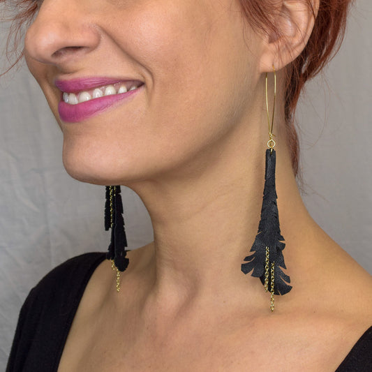 Black Feather Leather Earrings with Gold Chain Detail