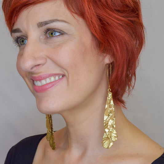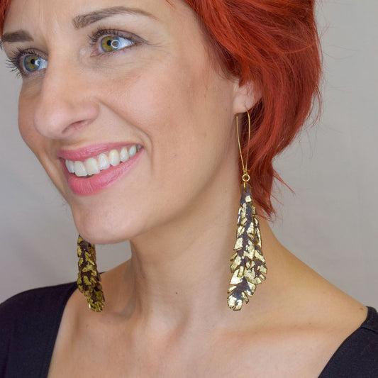 Feather Leather Earrings with Gold Metal Leaf- Chocolate