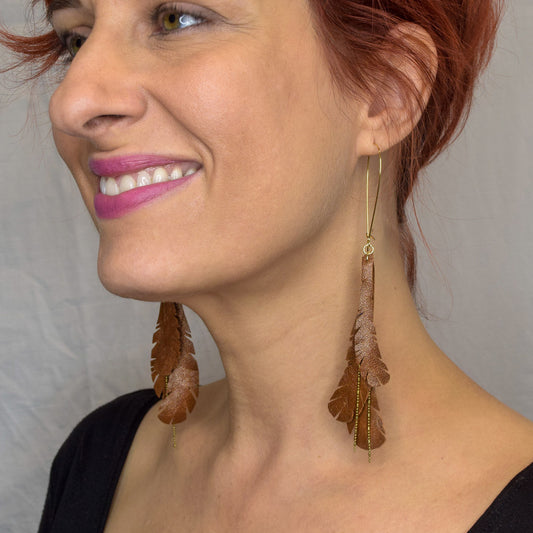 Caramel Feather Leather Earrings with Gold Chain Detail