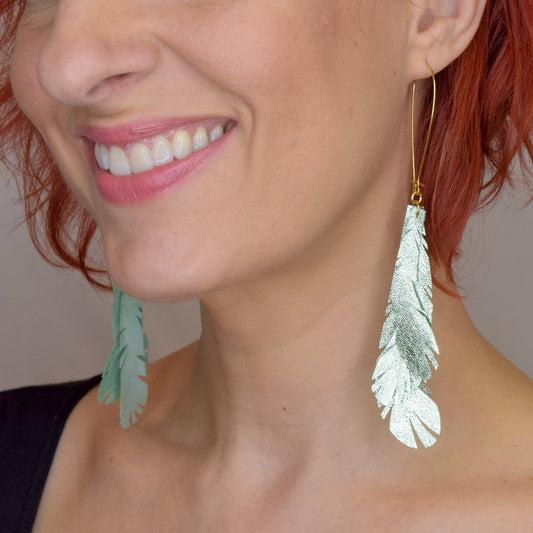 Metallic Feather Leather Earrings- Green