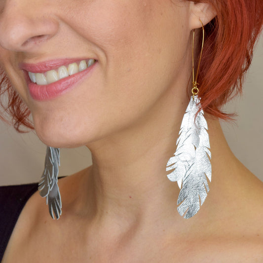Metallic Feather Leather Earrings- Silver