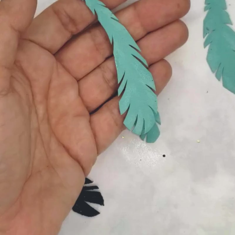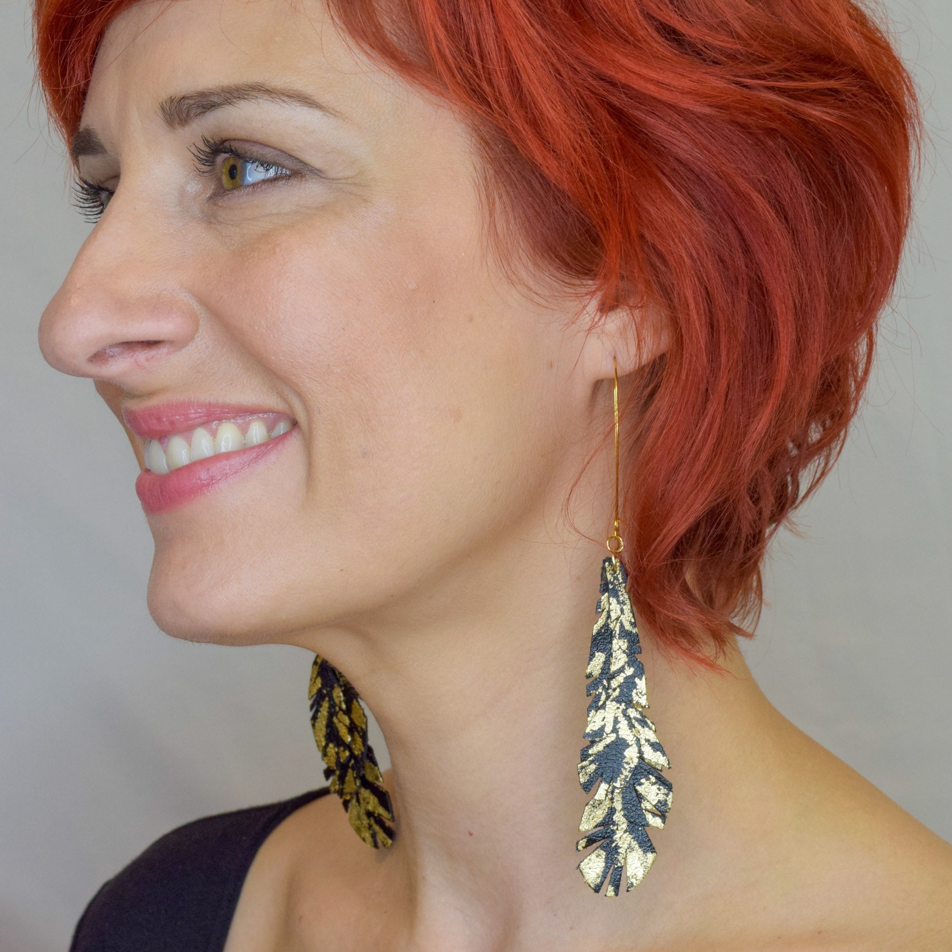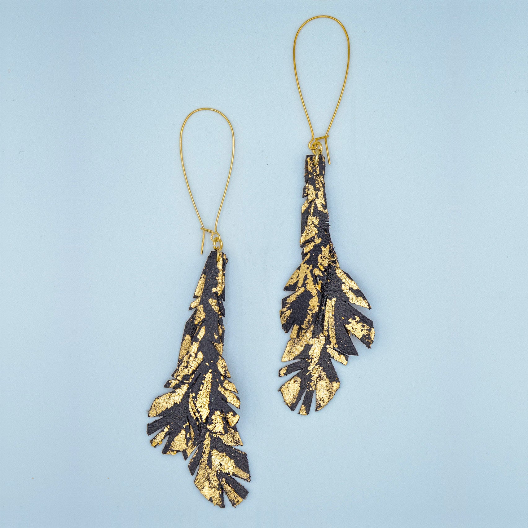Feather Leather Earrings with Gold Metal Leaf- Black